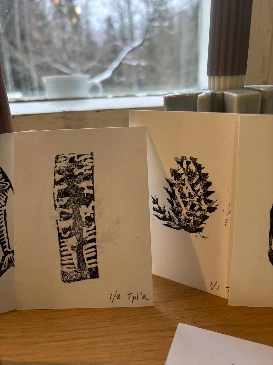 Teen töitä kulttuurin ja tapahtumien parissa mahdollistaen ennenkaikkea nuorten artistien ja tekijöiden töitä ja ideoita, mutta nyt sain keskittyä omaan luovaan tekemiseen. Alun analysoivista kokeiluista, podcastien ja kirjallisuuden inspiroimista varovaisista lähdöistä, löysin pikkuhiljaa tieni luonnon, valon ja värien äärelle. Maalasin, piirsin, kirjoitin ja kuvasin muuttuvia maisemia ja luonnon hienovaraisia nyansseja. Tammisaaren Chappe-museon näyttelyn inspiroimana solmin ryijysolmuin sammalikkoja, kaiversin linolevyille puita, käpyjä ja oksia.